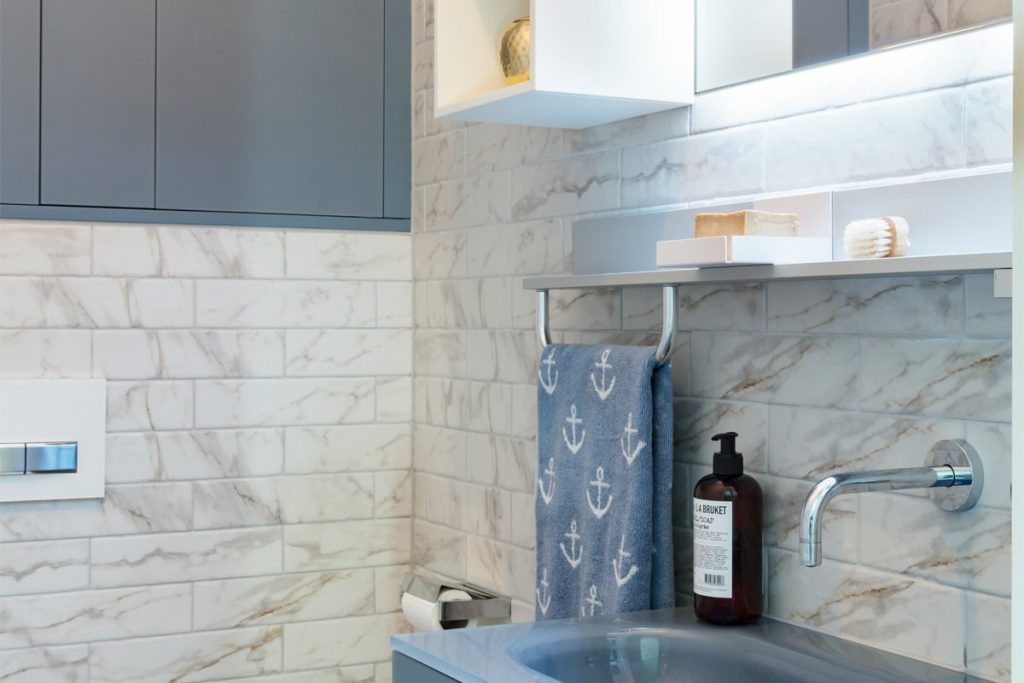 Air force Blue Glossy Glass/ White Matt Lacquered Units, Tap Gessi, Flush Plate Geberit, Tiles Marrazi