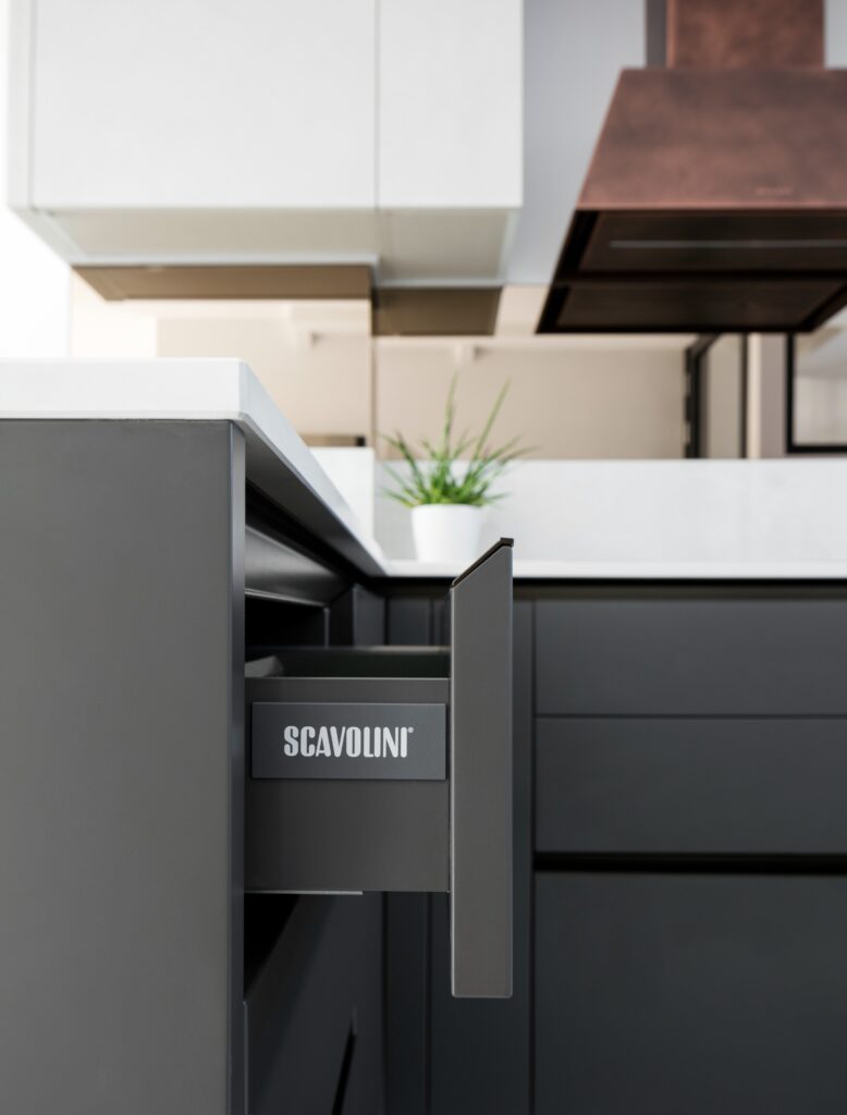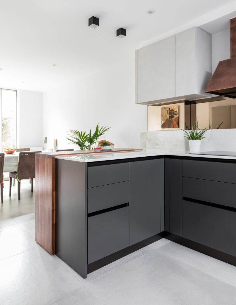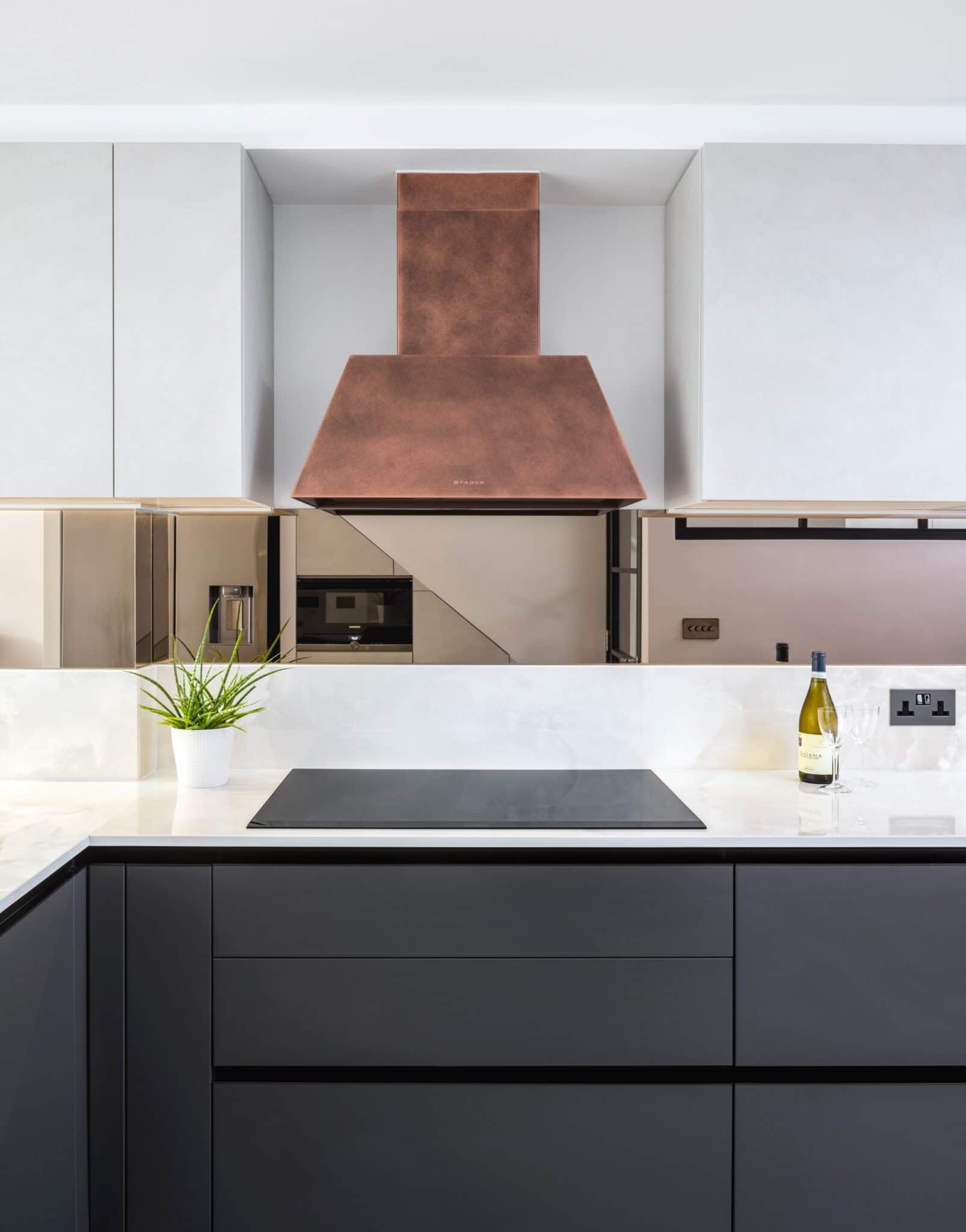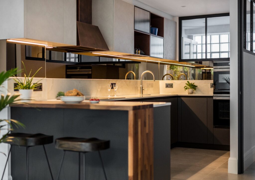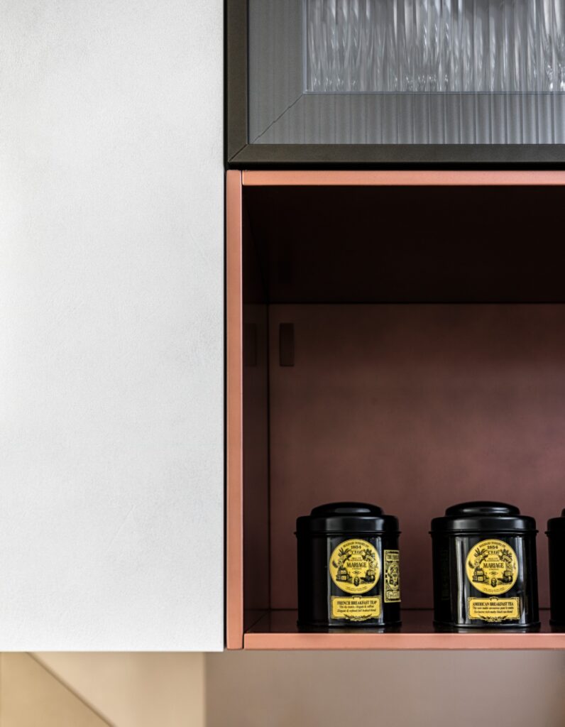 Iron Grey Mat Lacquered/Azimut Melamine , Stained Cooper Lacquered open boxes and Diesel Ribbed Glass wall units with bronze plinth and hand profile Worktop Dekton Helena and bronze mirror splashback & Siemens, Quooker,Faber