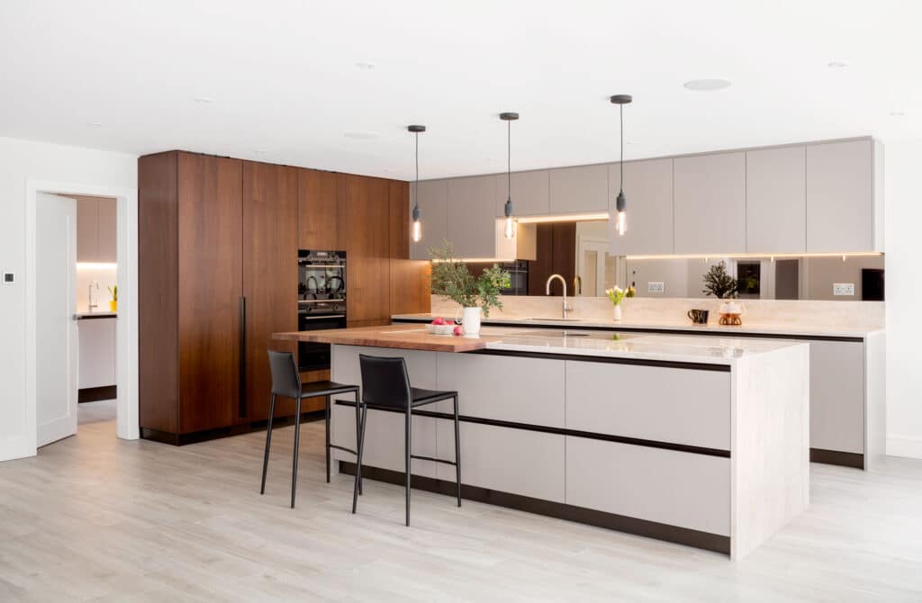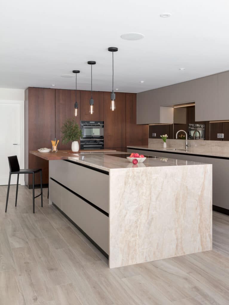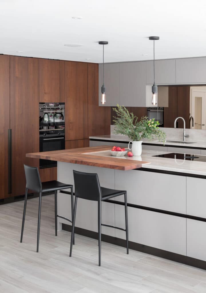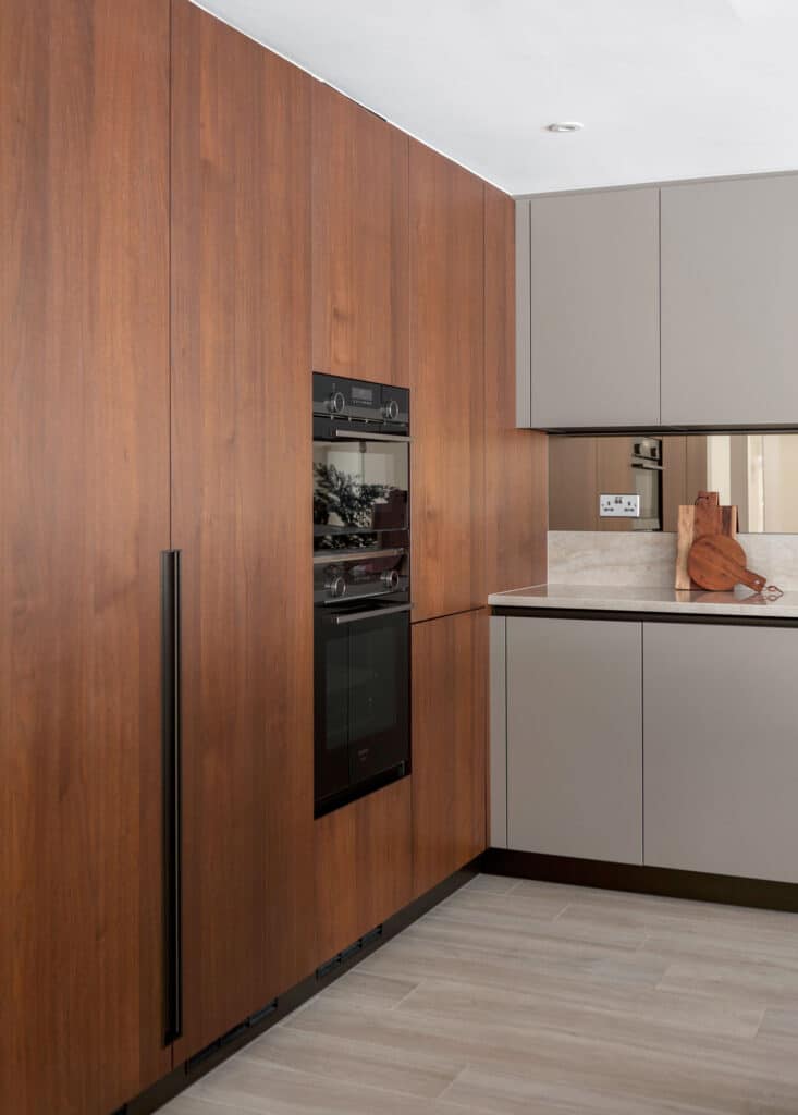 Flint Grey Melamine /Ulster Walnut Veneer wood, Dekton Stonica Arga, Siemens, Bora, Quooker